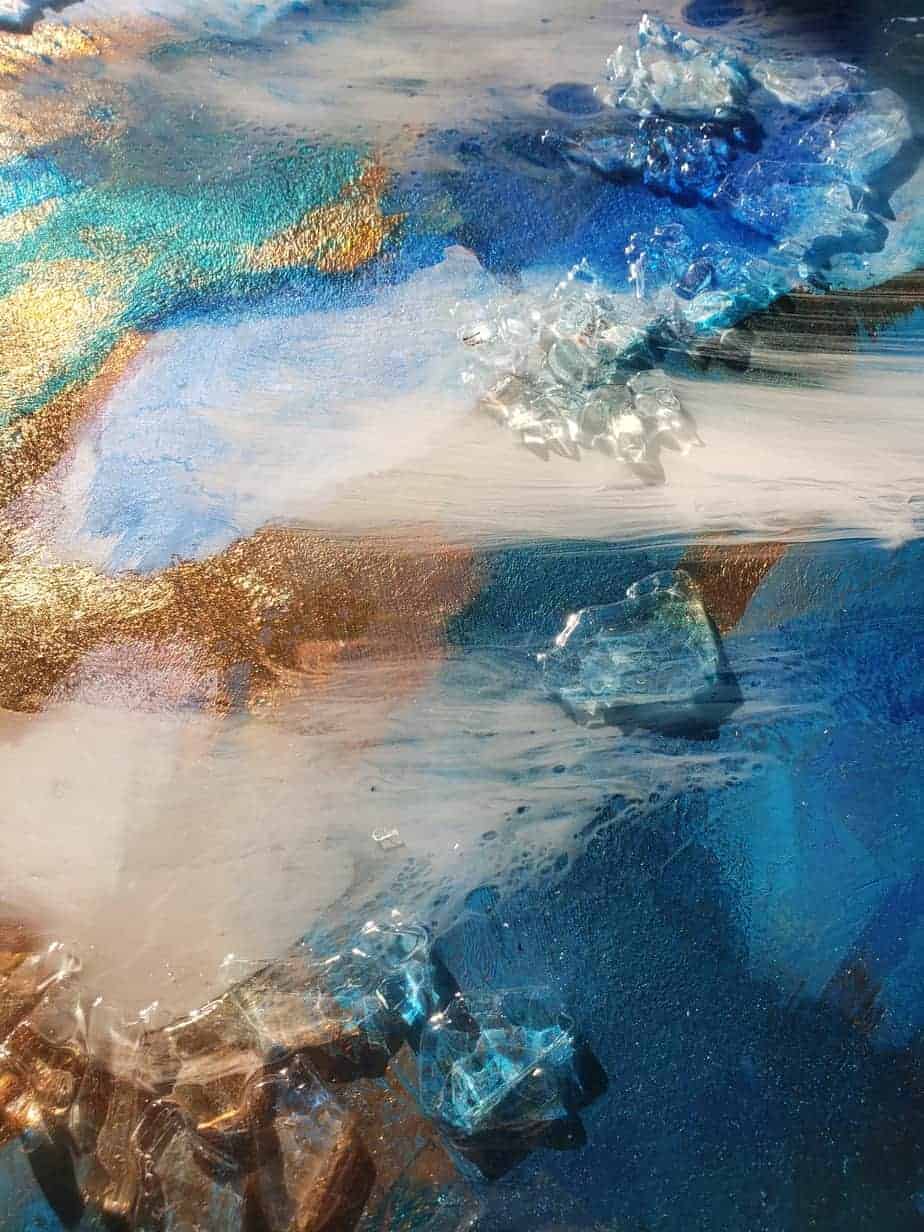 When he came to me to create the centerpiece of the living area, we discussed many concepts. In the end, we settled on the idea of creating a flowing piece that references the neighborhood’s proximity to the Connecticut River and Long Island Sound. We should bronze metallic highlights on the side edges of the triptych to flow into the space that was finished in a color called Natural Linen.