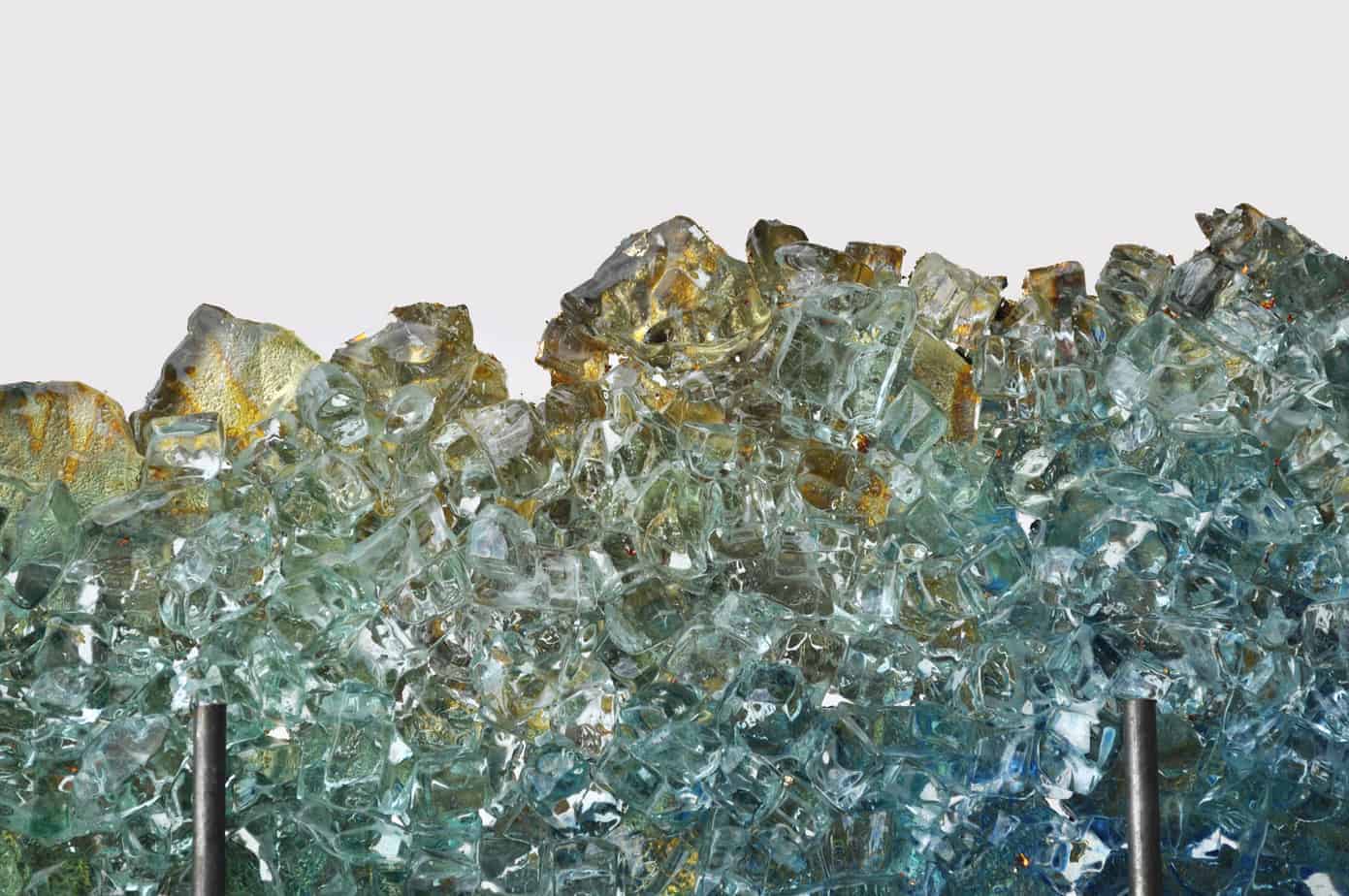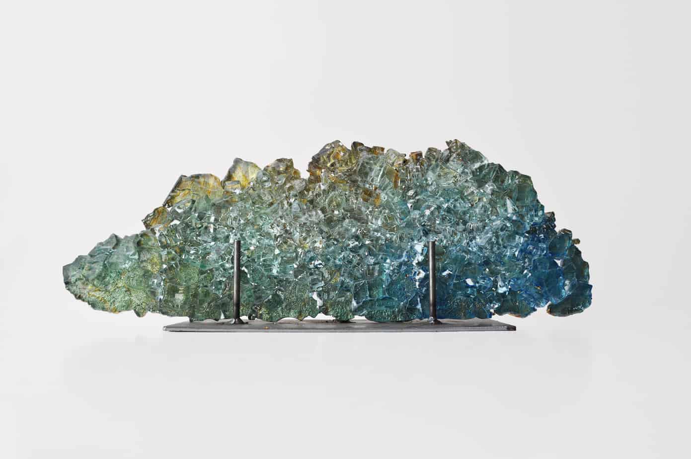 New work, Dreamscape 40, “Zephyr Cloud.” Created from reclaimed glass, blue and green pigments and variegated copper foil. Displayed in raw steel stand.