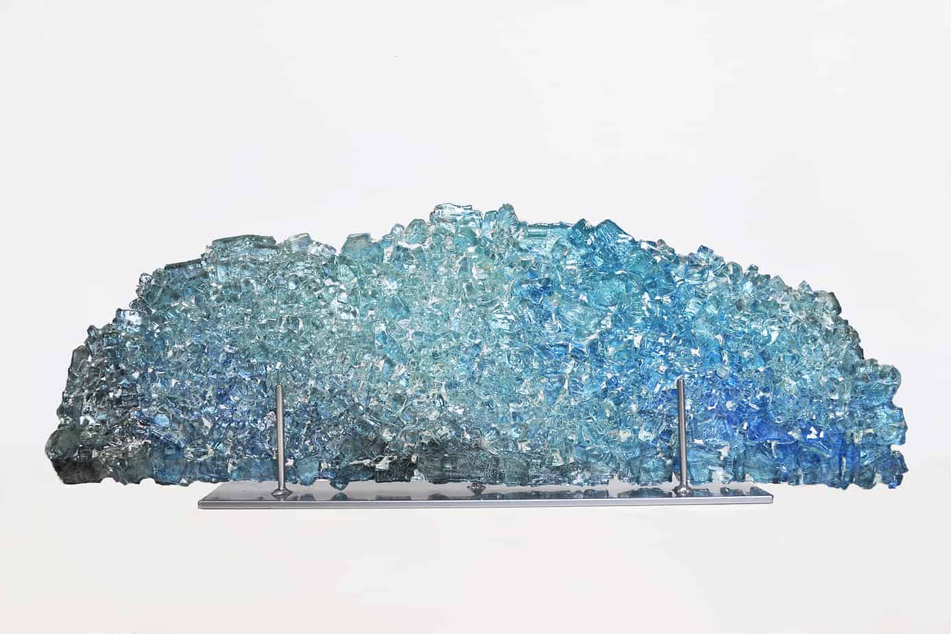 Custom piece for a Chicago collector. Reclaimed glass, pigments, silver-toned foil displayed in a powder-coated steel stand. 31″ x 10″ x 4″ Detail shots: