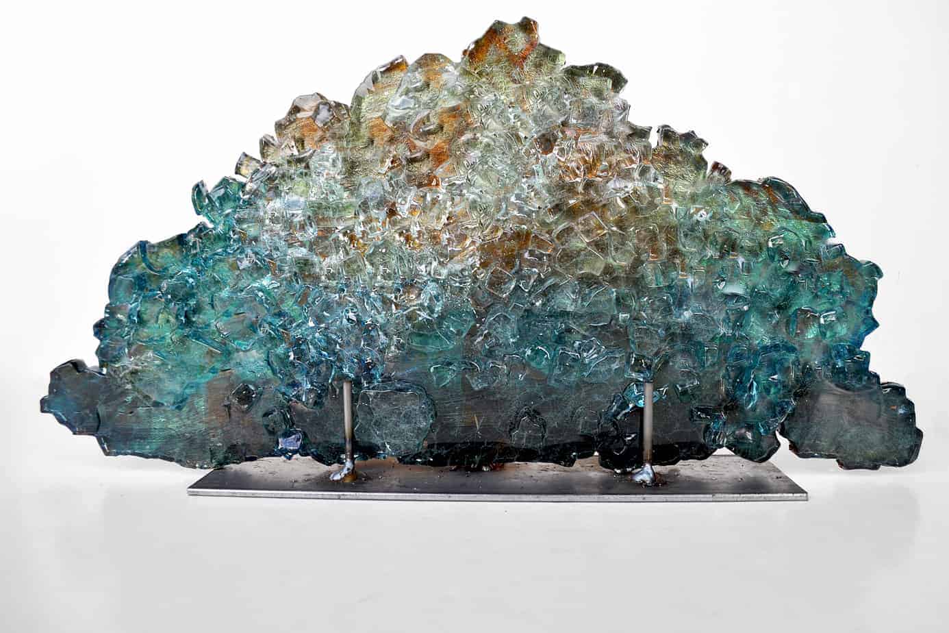 Even in the dead of winter, I feel spring coming on. This tabletop sculpture is Dreamscape 94. Created from reclaimed glass, pigments and variegated metal… Read More »Dreamscape 94