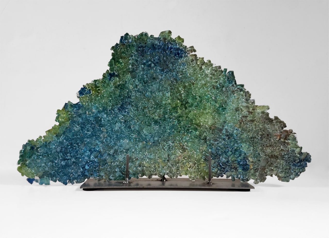 Small table top sculpture created from reclaimed glass, blue and purple pigments and variegated metal foil. Arrives ready to display with custom steel stand. Measures… Read More »New Work – Dreamscape 65