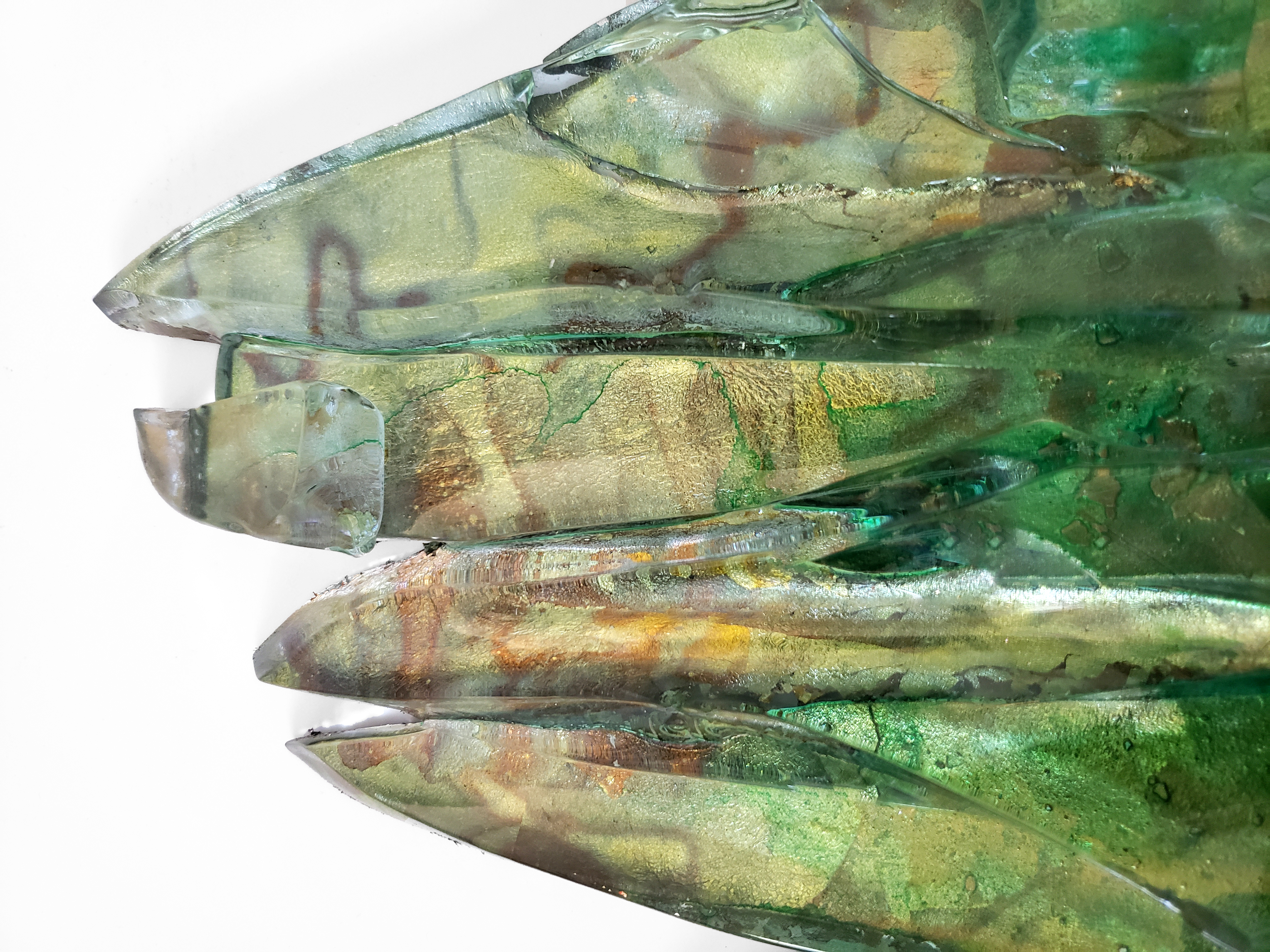 Dreamscape 70, 12″ wide by 8″ tall. Created from reclaimed glass, pigment and variegated metal foil and arrives ready to display in a raw steel… Read More »New Work – Dreamscape 70