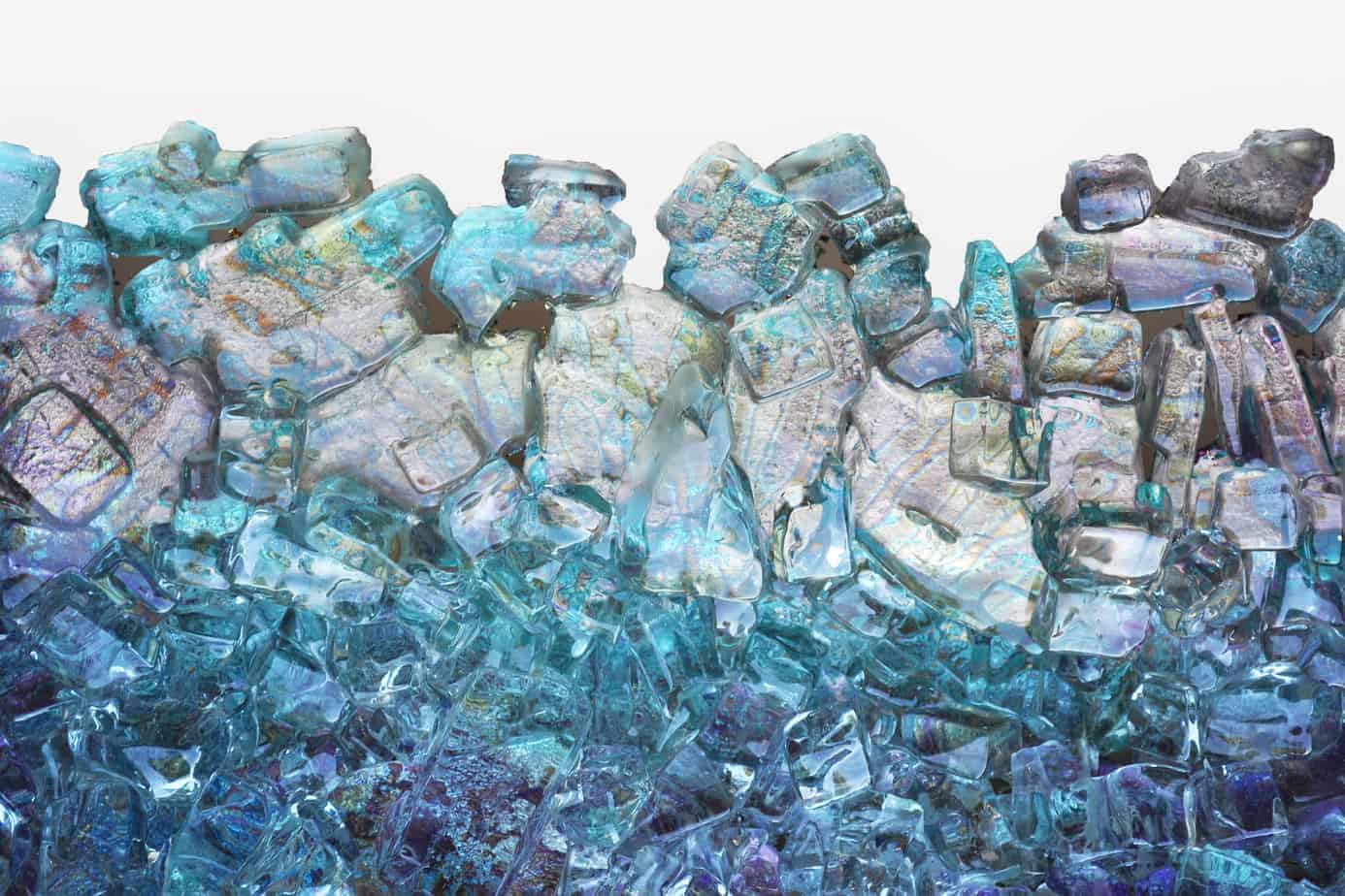 Recycled glass, pigments and variegated metal foils are combined to create this 16.5″ diameter art vessel.