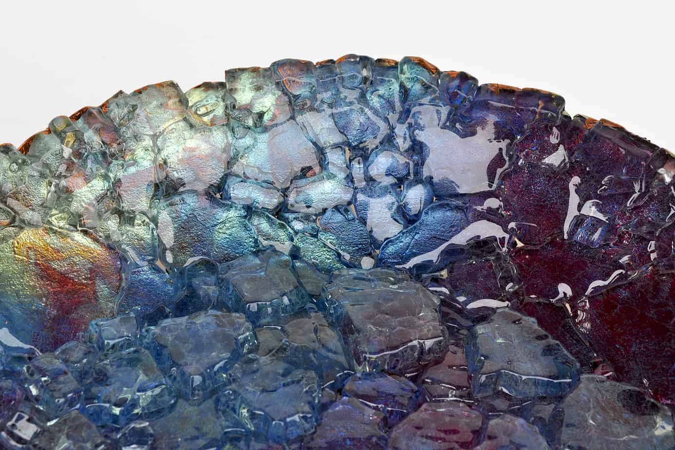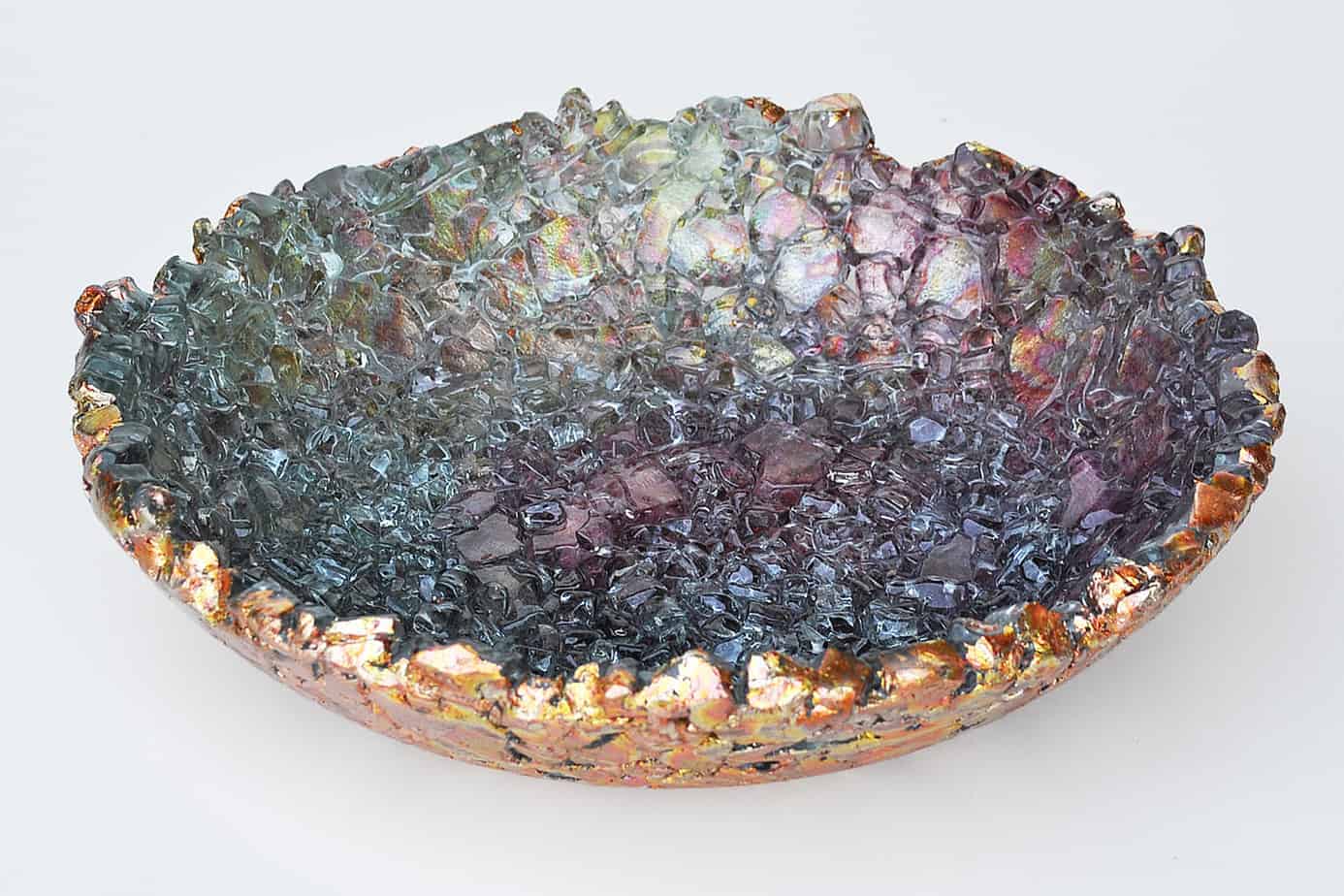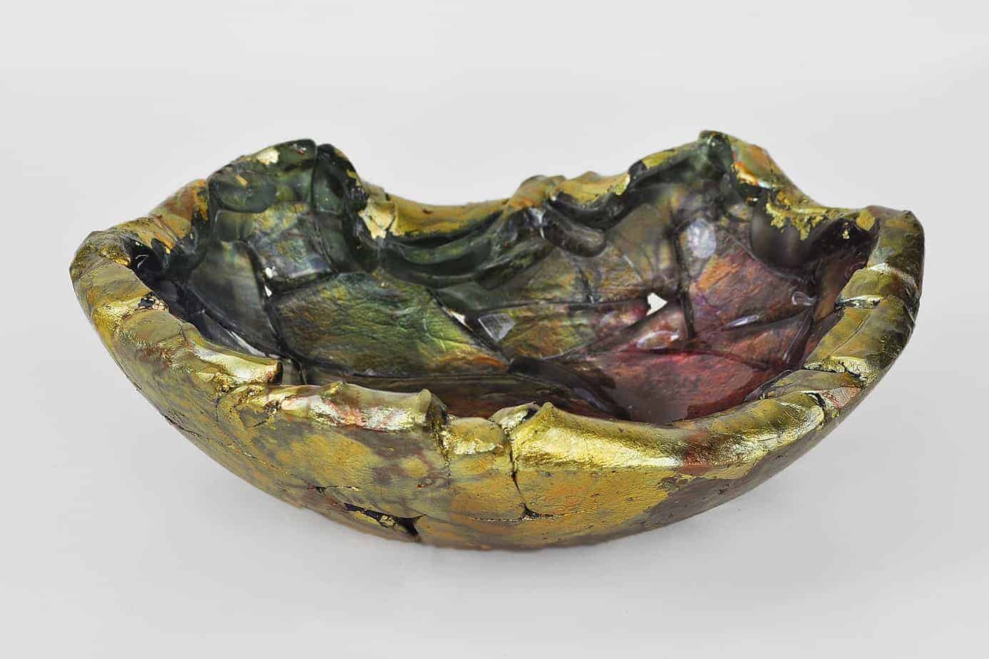 Reclaimed glass, multiple layers of pigments and various types of variegated and non-variegated metal foils. Measurements 26″ wide x 16″ deep x 5″ tall.