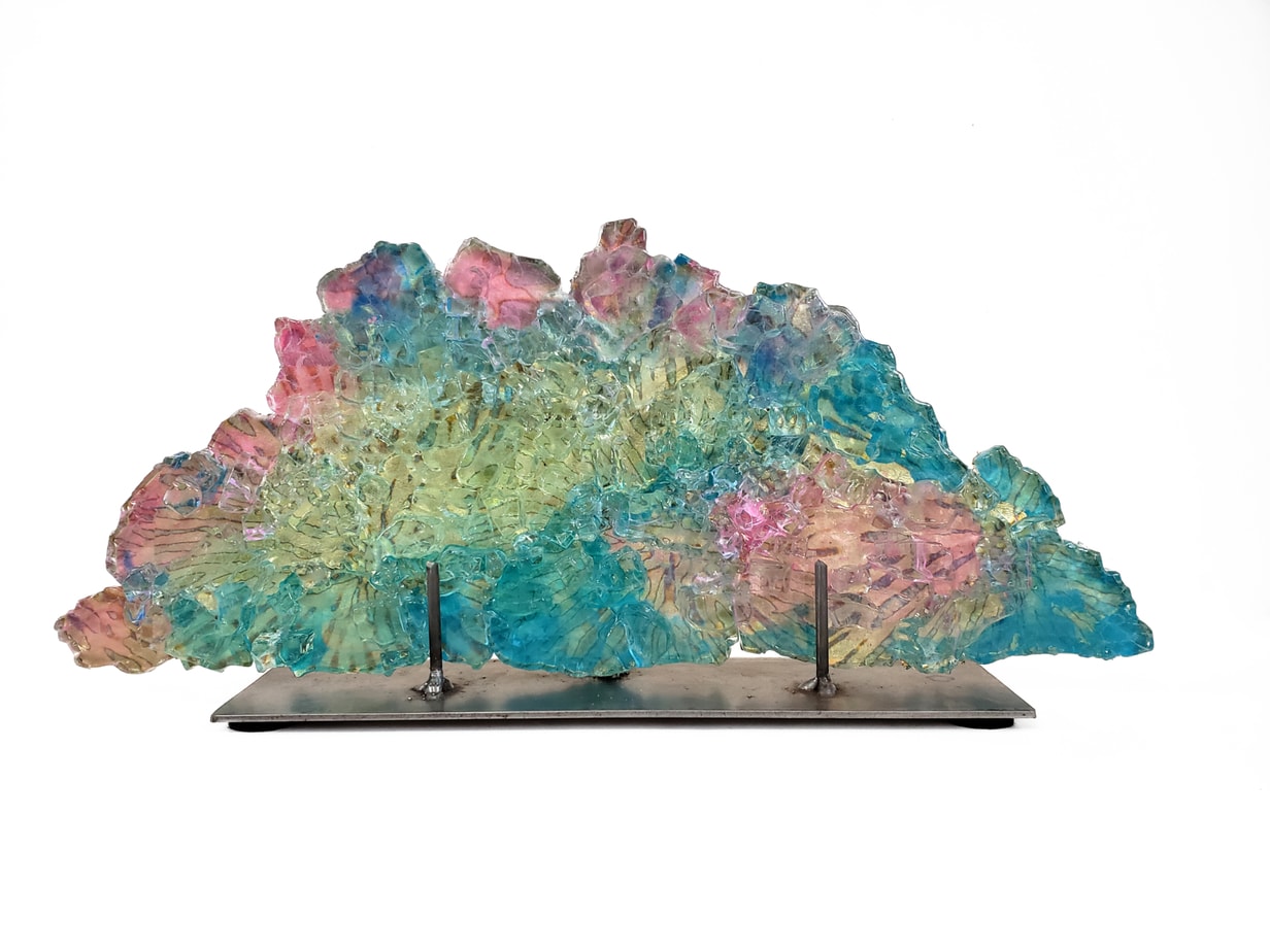 Dreamscape 92 is created with reclaimed glass, pigments and variegated metal foil. It arrives ready to display in a raw steel stand.